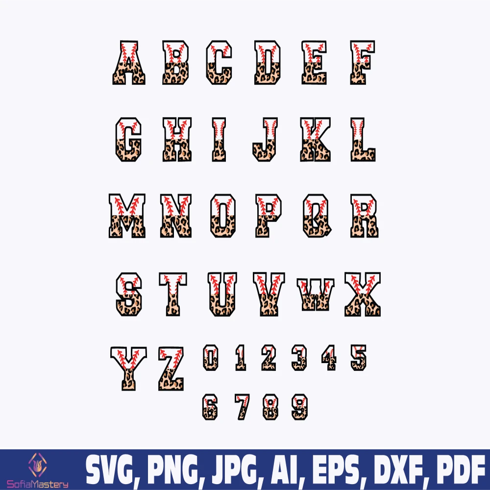 baseball Font SVG png, half leopard baseball font letters alphabet and numbers svg png, Stitched Letters and Numbers, Gridiron Alphabet SVG