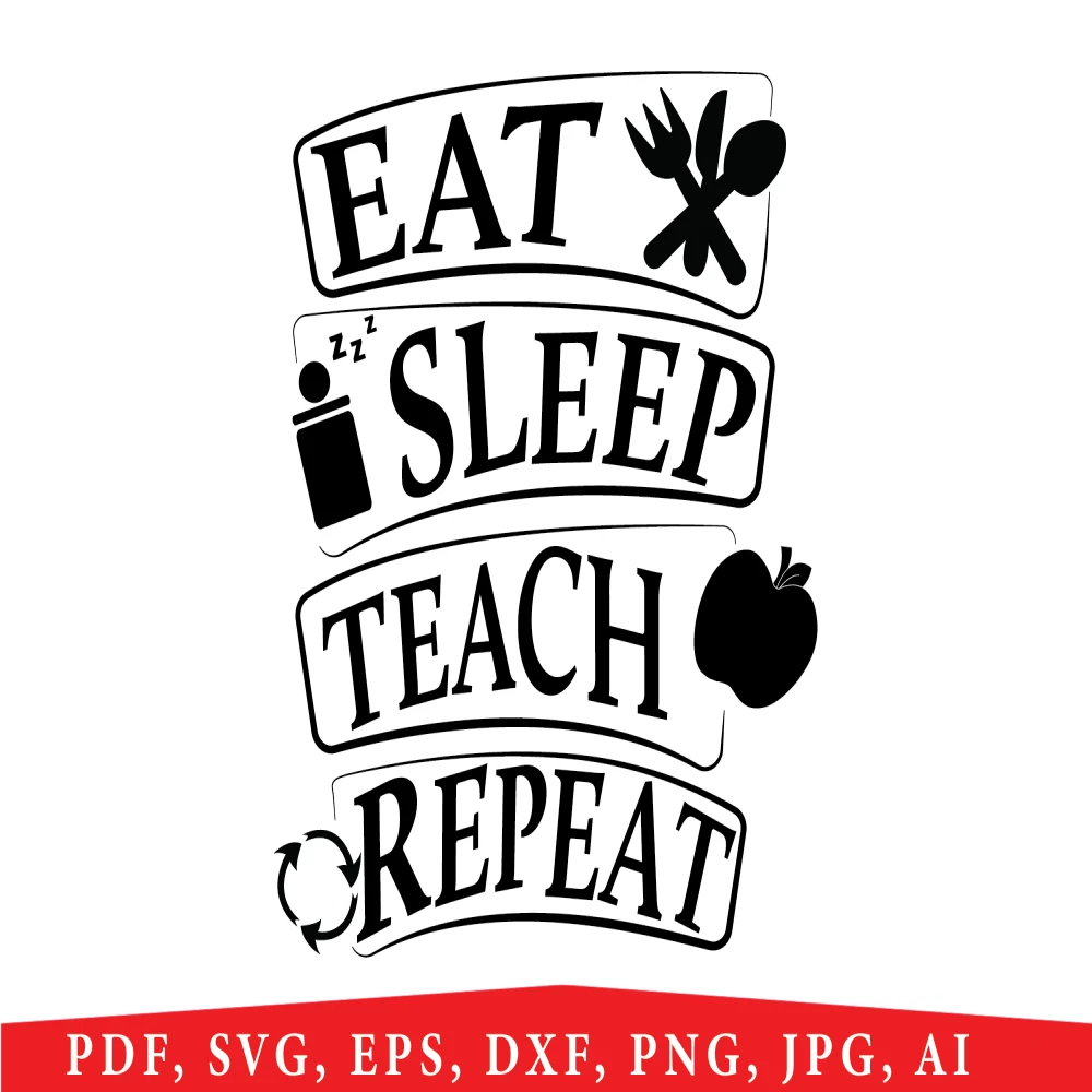 Download Eat sleep teach repeat svg file includes Svg, png, pdf, eps, ai, pdf, dxf file size 2000*2000px you can use it in print shirt, stickers, baby infant, cap, and all clothing