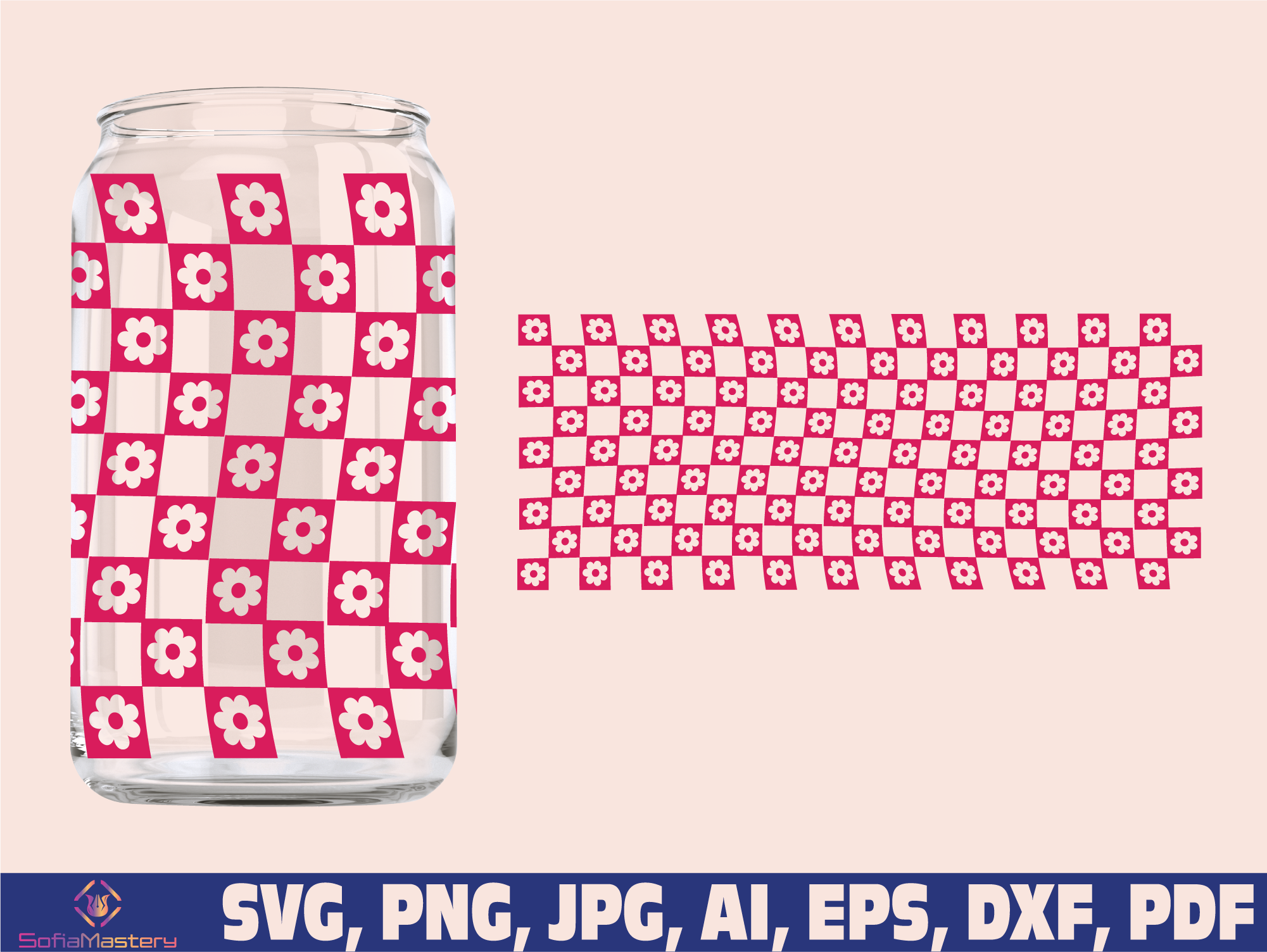 Retro Flowers Checkered, Checkers Svg, Checkered Full Wrap Glass, Checker Libbey Glass Svg, 16oz Full Wrap Svg, Can Glass Svg, coffee glass