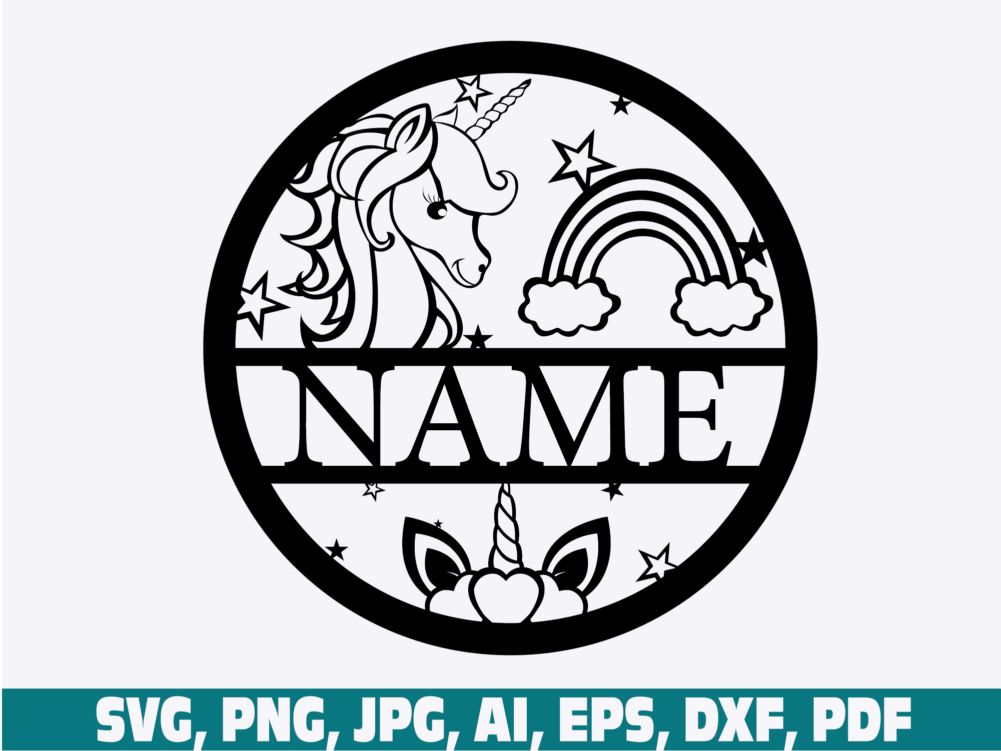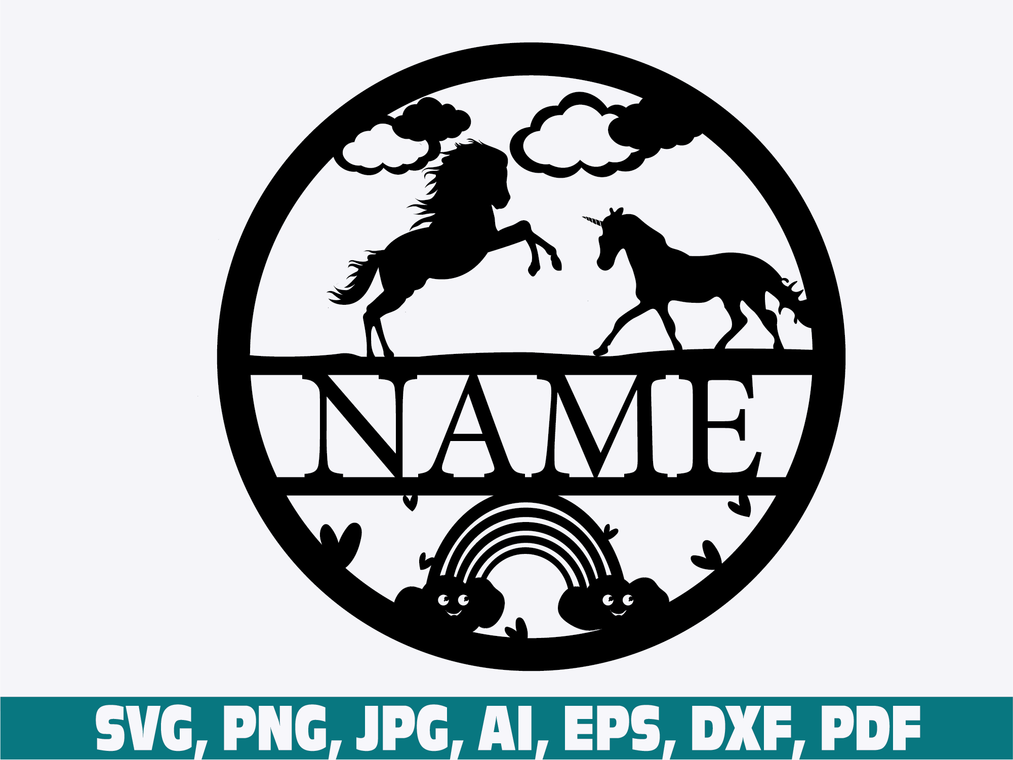 Name sign cartoon unicorn theme laser cut template, door or wall hanger, vector file svg, ai, cdr, dxf instant download