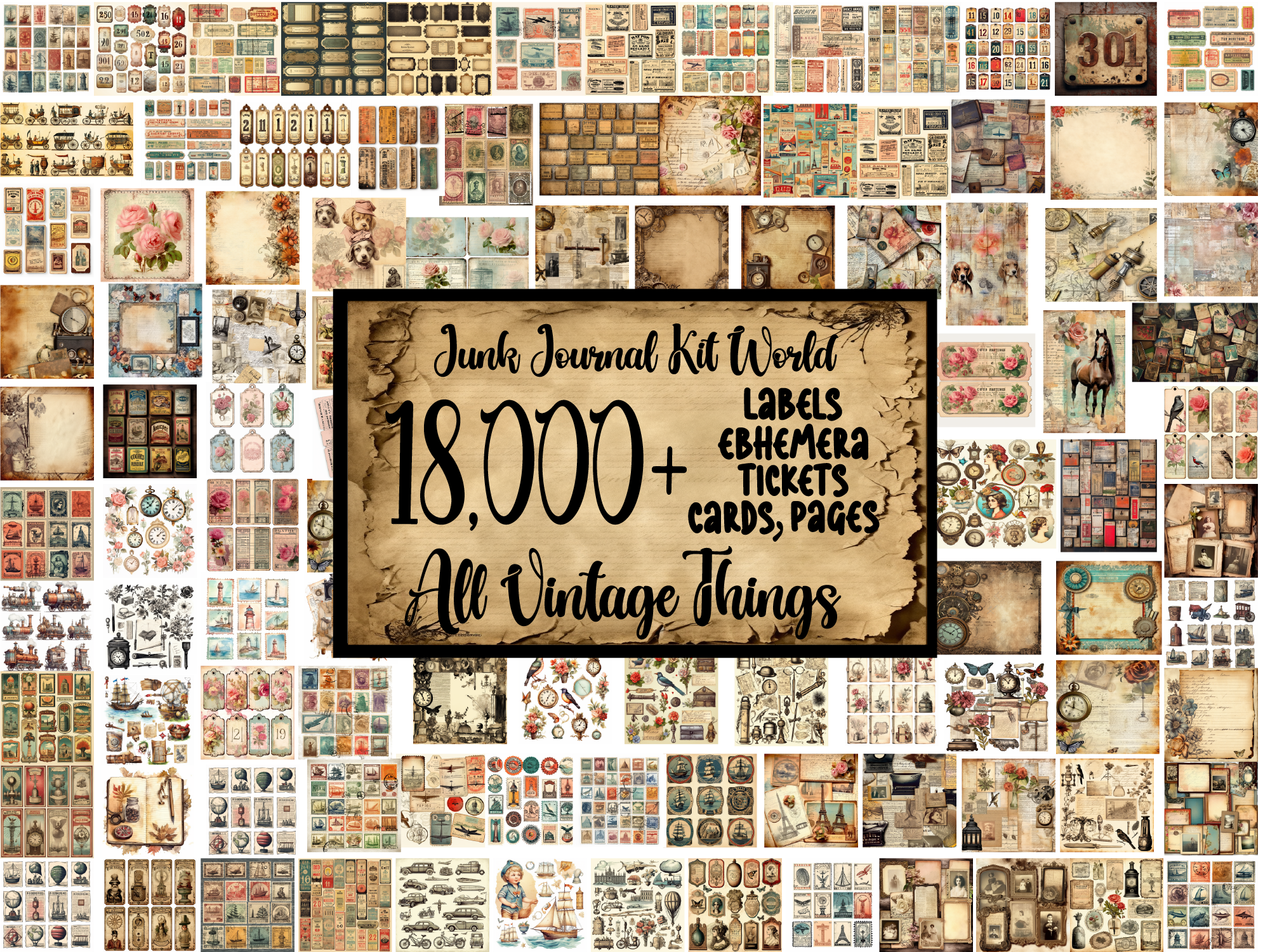 Hi, and thanks for trust us!!! This bundle is too large and you will find in it tons of tons of vintage junk journal kits, like cards, tickets, tags, stamps postcards, classic vintage pages, vintage of all things you need to make awesome junk journal!!! you will get over 25,000 designs!!! Commercial license and life time access to all new images!